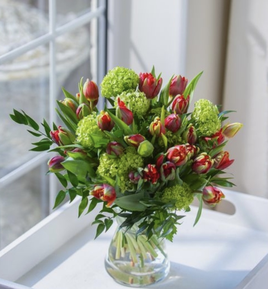 Bouquet compuesto por 18 Tulipanes rojos acompañados de flores bulbosas verdes de temporada.